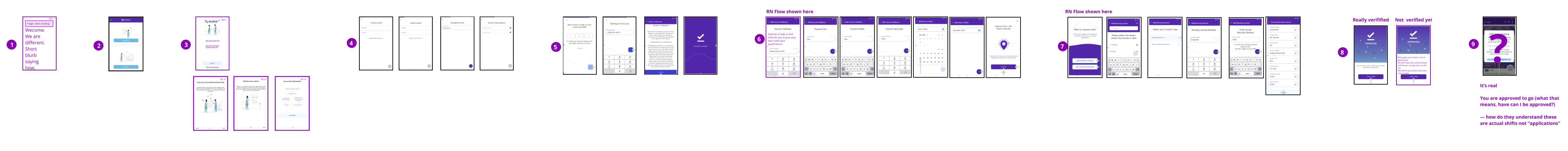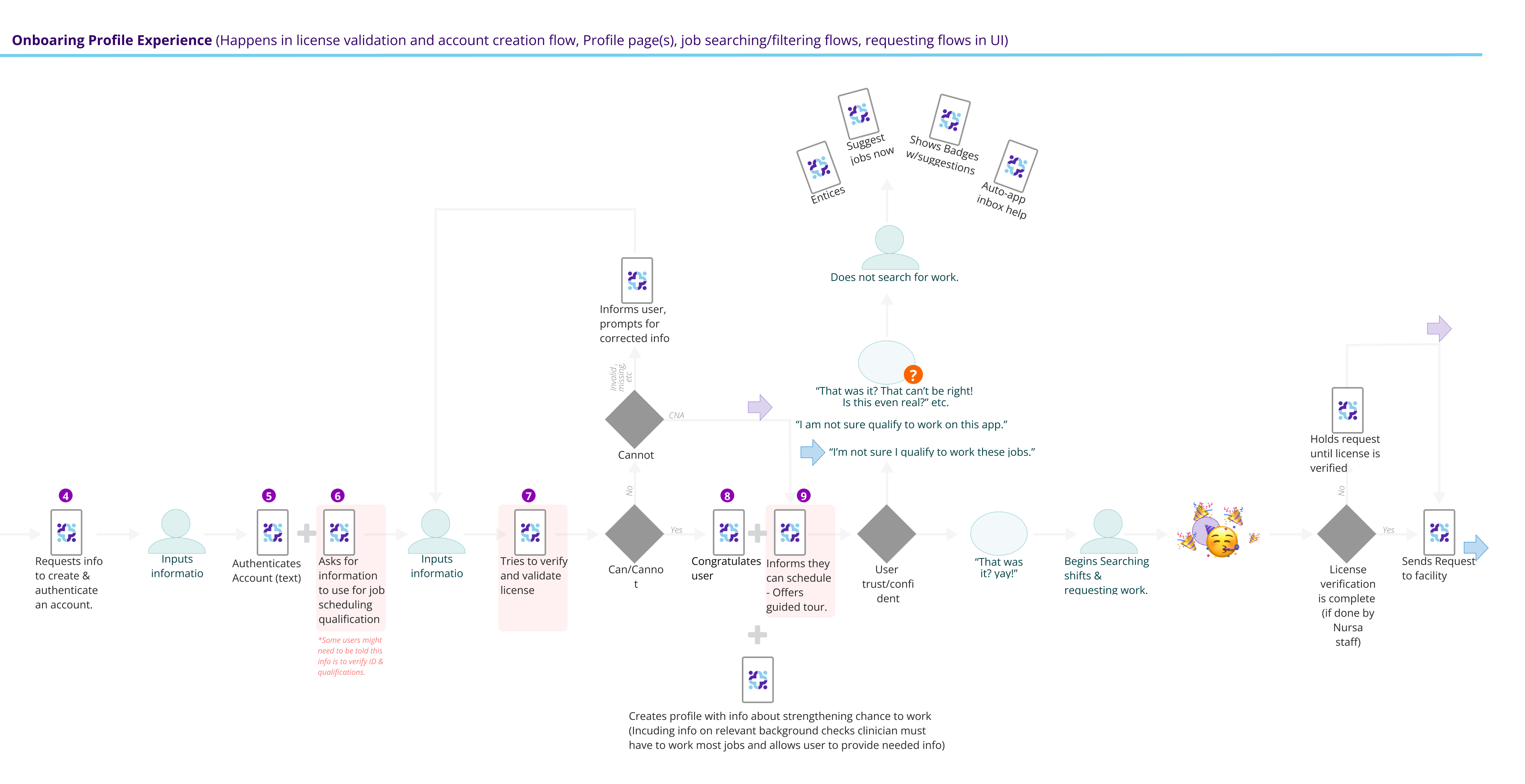 All of this is to say that to completely “onboard” a clinician user, it was imperative for me to analyze and evaluate not only the registration flow but to evaluate the experience new users had clearing license validation and clear screenings, creating and strengthening their profiles, shopping for work and communicating with potential employers. And this was the first challenge I was asked to tackle for the product.