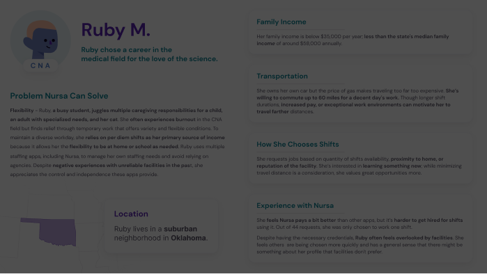 This product represents a new kind of working experience for Nurses and care clinicians. It's a marketplace that cuts out the staffing agency. Self-qualifying and self-selecting when and where to work from profile postings from facilities was an entirely new (and scary) paradigm.