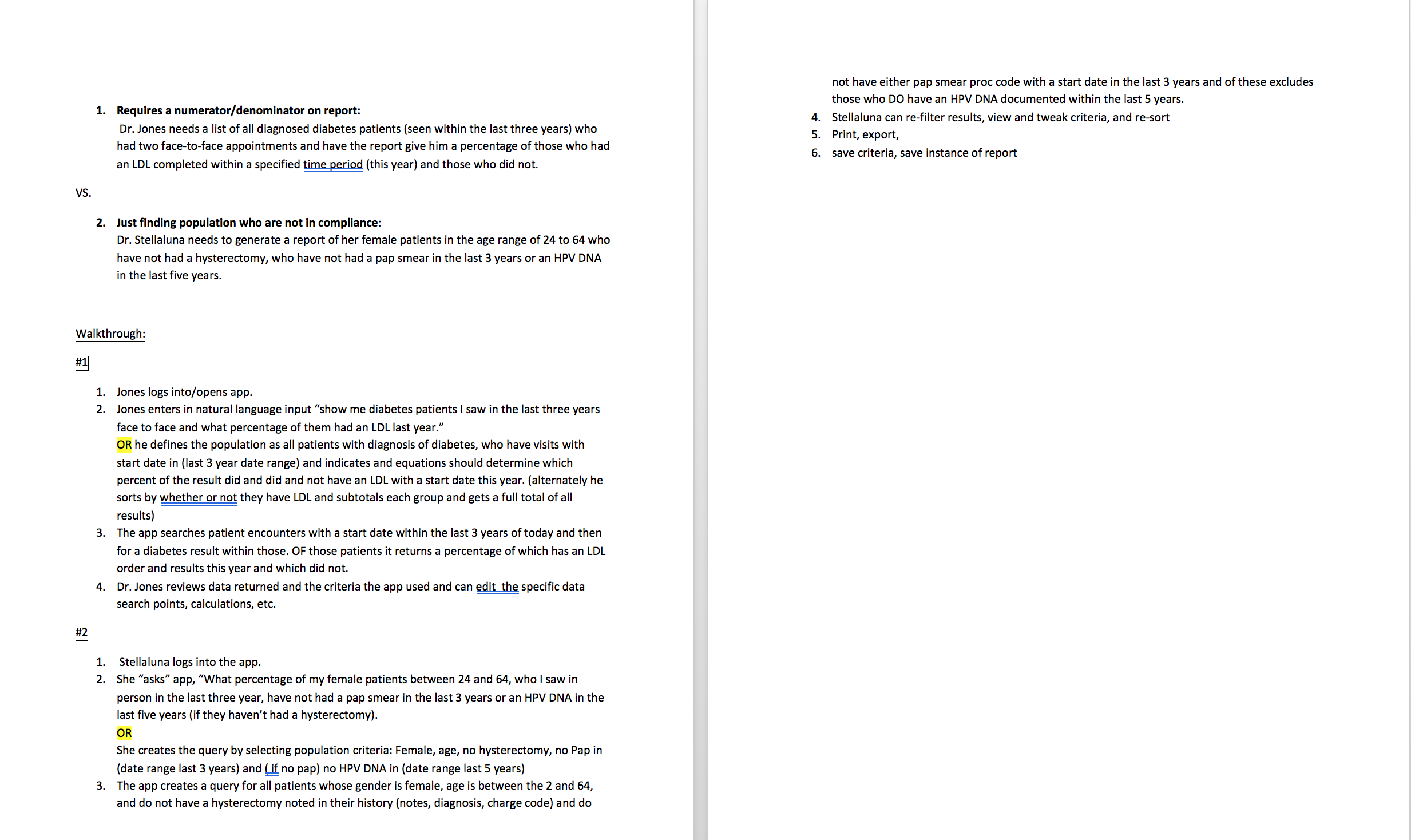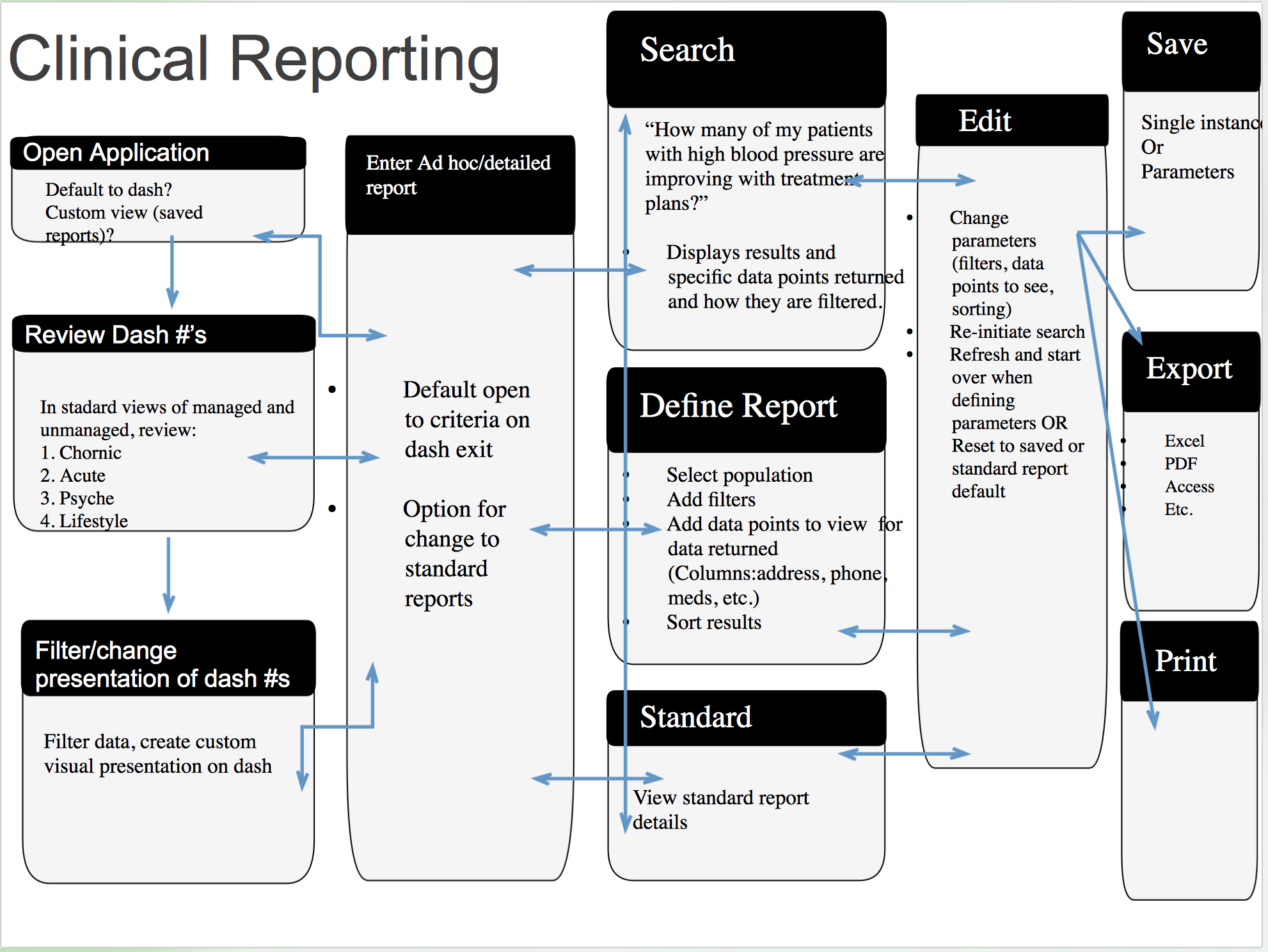 These were the users scenarios I wrote-up for the project management team to help the product team understand how the product could (should) behave to serve these dashboards and reports to the user. These were to help facilitate design workshops and to nail down the ultimate product requirements.