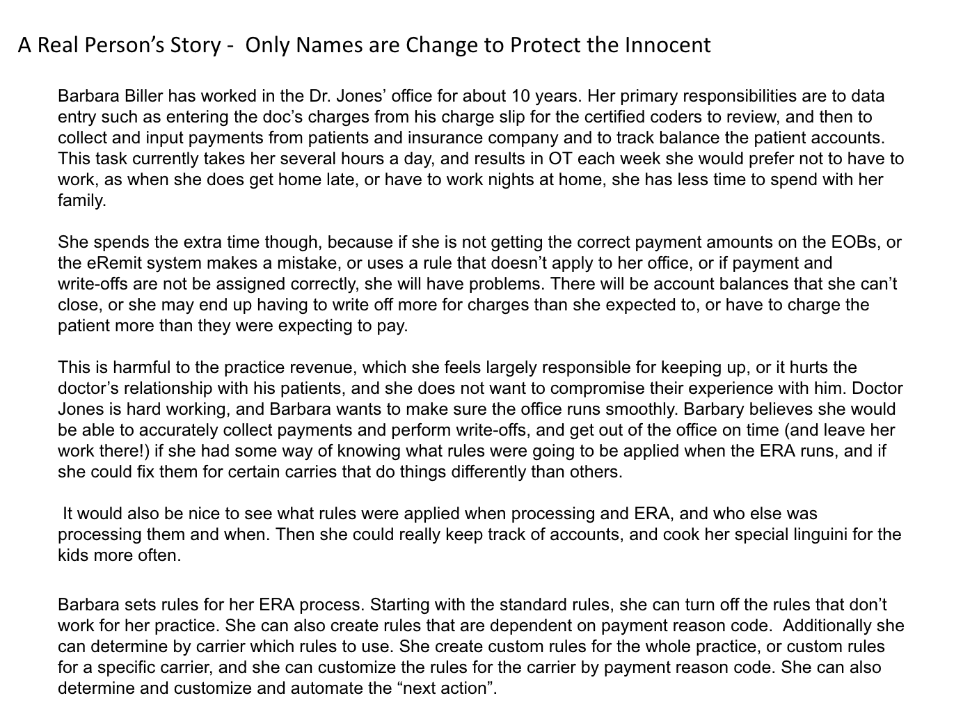 The PM and I got some several medical billers on a WebEx. We asked them why the were mostly working manually when our powerful system could do their work for the.