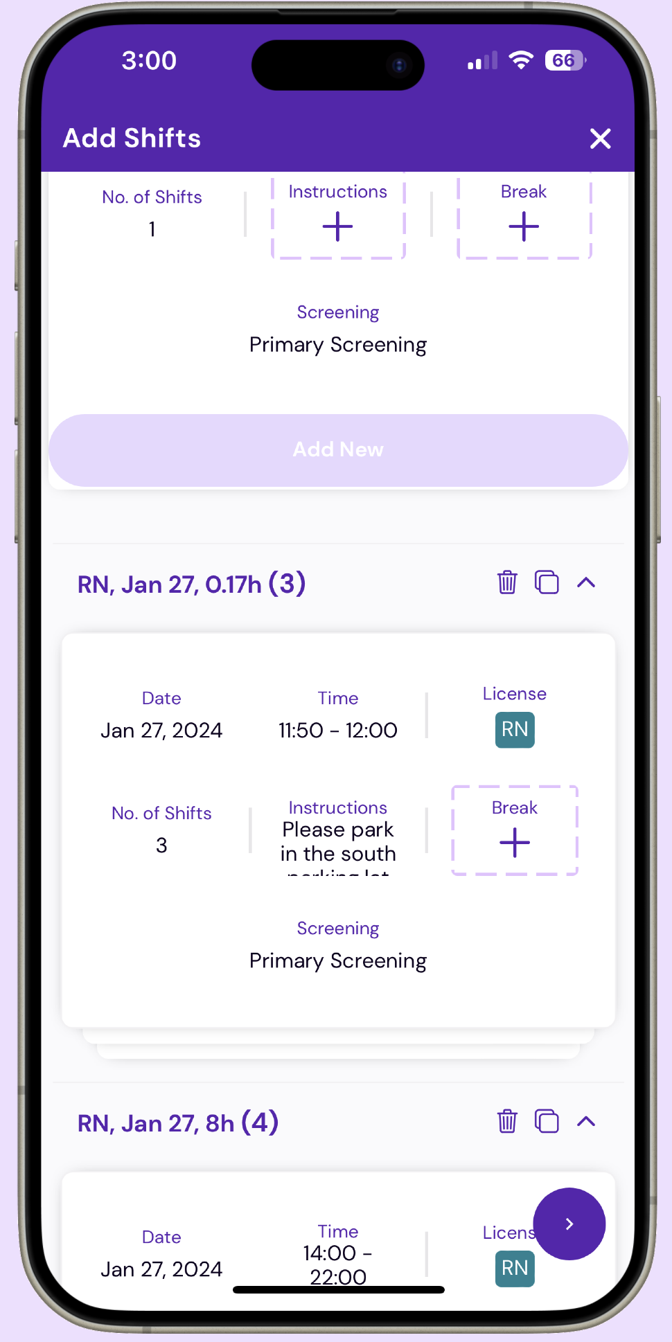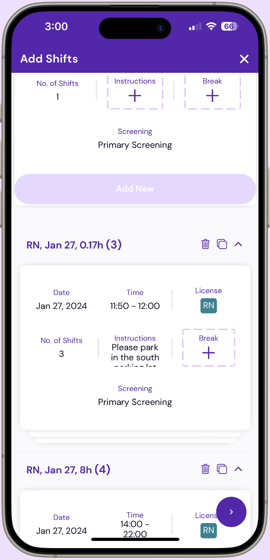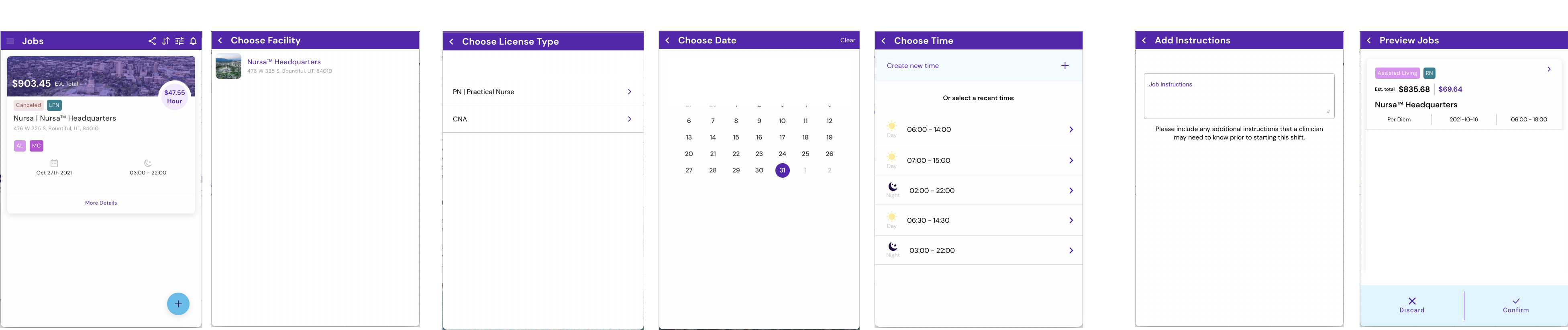 The app launched with a flow that allowed the medical facility to create a shift posting and include the date, time, and describe the type of license and qualifications they would like applicants to that shift to have.