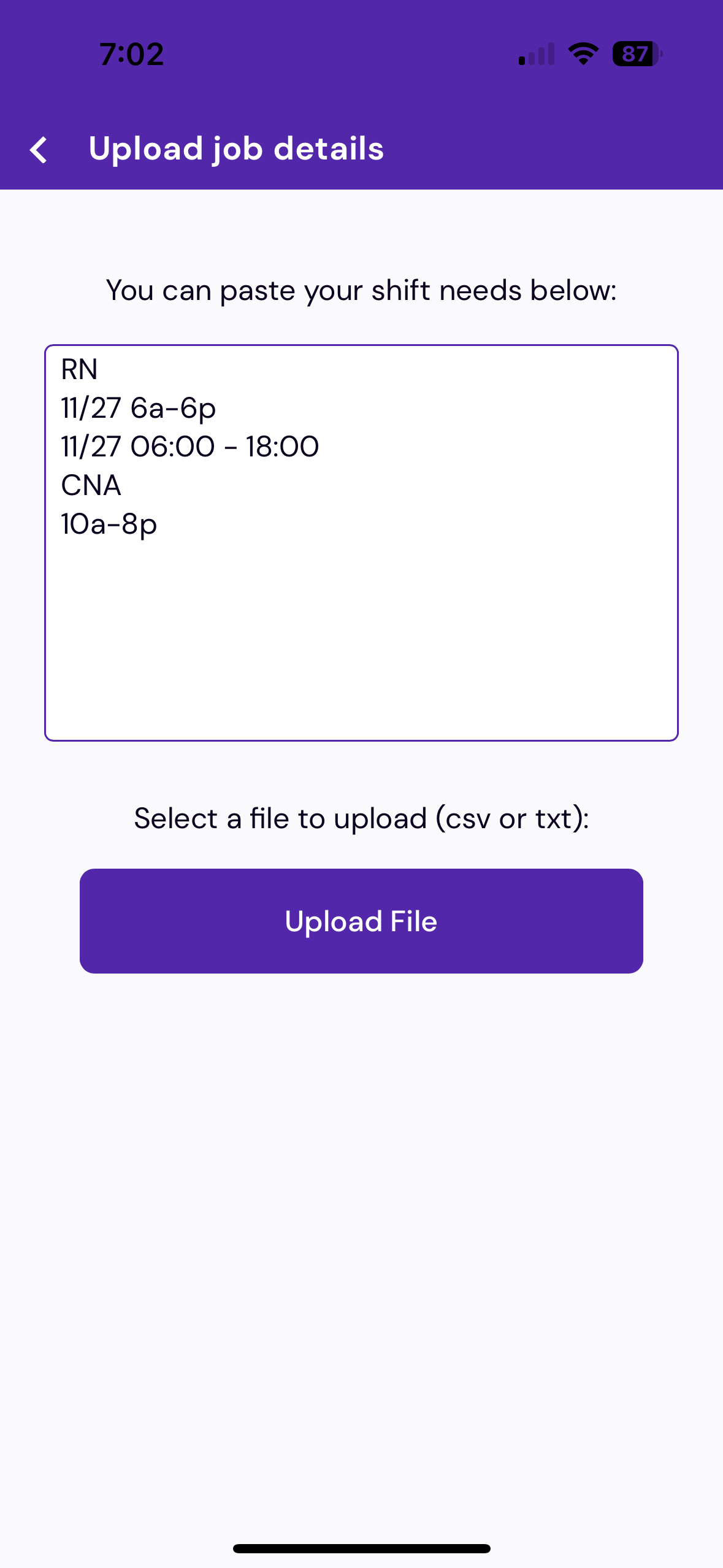 The suggested test criteria was that the updates to the bulk upload tool would make it easy and fast for users to upload hundreds of shifts at a time from a text file.