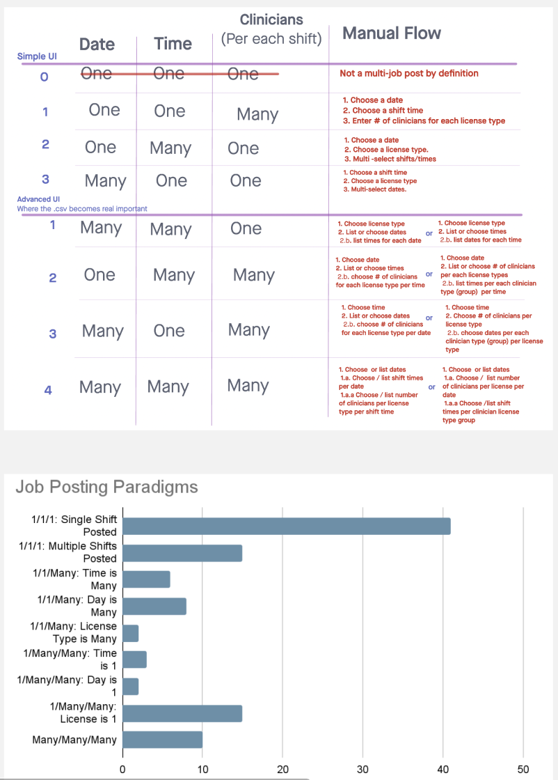To design the tool effectively, I believed it was also critical l to understand the commonalities and variations among the jobs. I noted that within the bundles of shifts posted in a session, there were subsets of identical shift needs, or nearly identical needs with variation in the dates over a few days, or the time over a single day, or sometimes the type of clinical help requested.